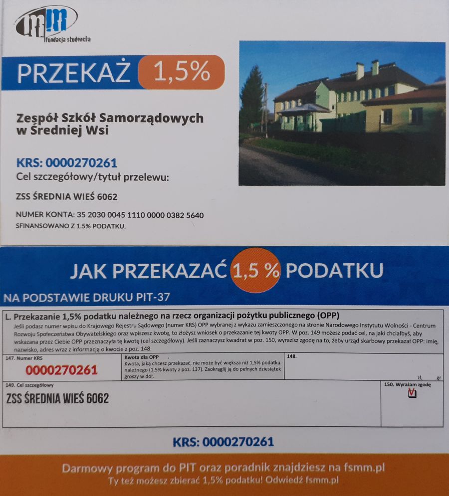 W tym roku po raz kolejny można przeznaczyć 1,5% podatku na nasz Zespół Szkół Samorządowych w Średniej Wsi. Wystarczy podczas wypełniania PIT-u postępować wg instrukcji podanej na umieszczonej poniżej wizytówce. Kwoty zadeklarowane w PIT-ach przekazane zostaną Fundacji Studenckiej "Młodzi - Młodym" z Częstochowy, która koordynuje całą akcję, a po zakończeniu rozliczania zeznań podatkowych, Fundacja będzie opłacać przekazane im przez nas faktury za zakupy pomocy lub organizację wycieczek dla naszych uczniów. Wszystkim ofiarodawcom gorąco dziękujemy!