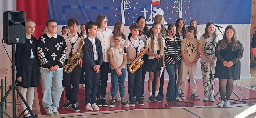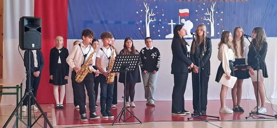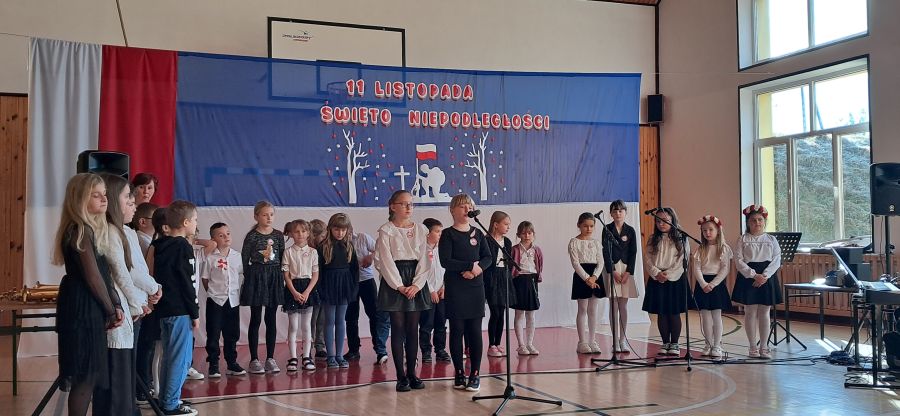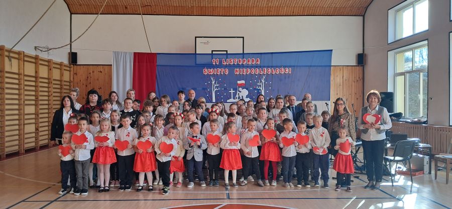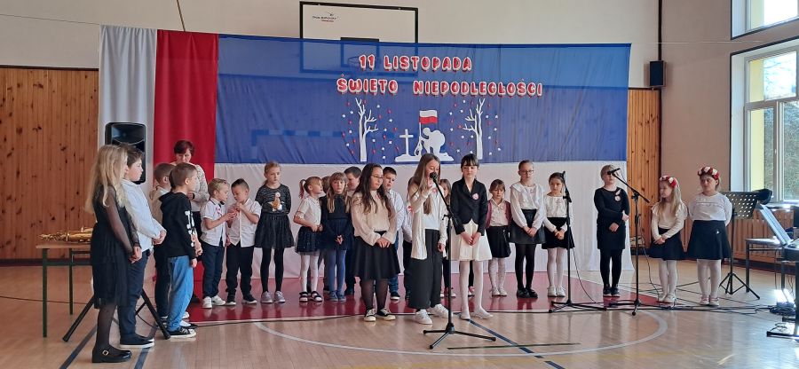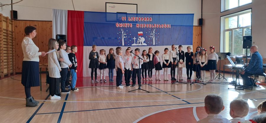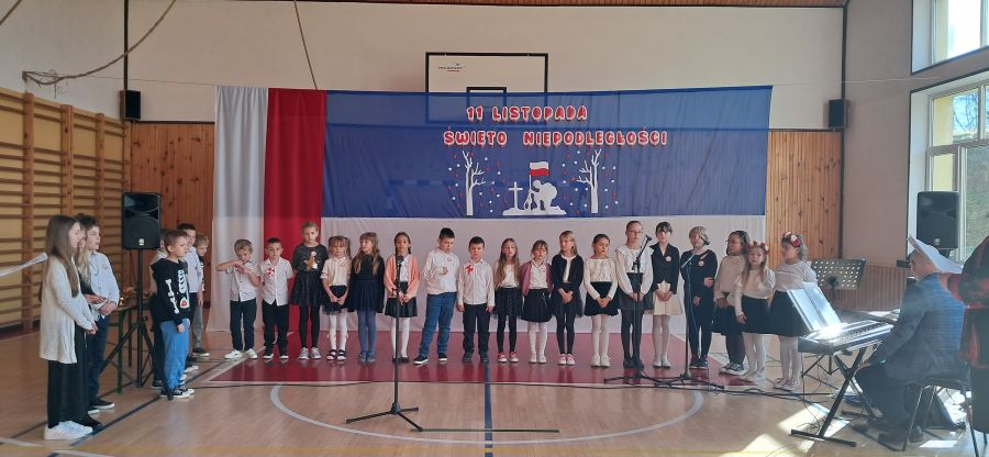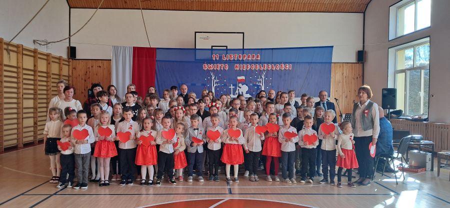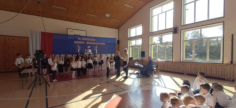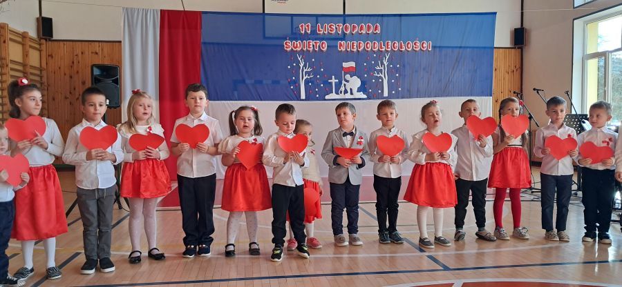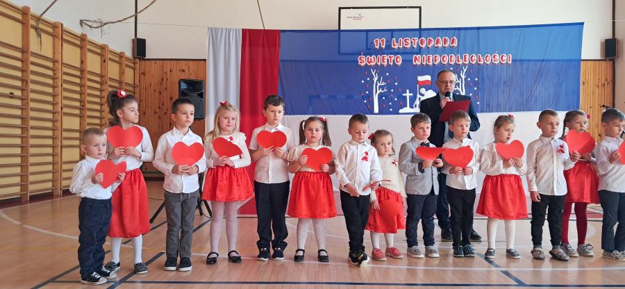 Uroczystość rozpoczęły najmłodsze dzieci - przedszkolaki oraz uczniowie klas I - III. Dzieci z przedszkola z wielkim zaangażowaniem recytowały krótkie wierszyki patriotyczne oraz prezentowały biało-czerwone symbole narodowe. Młodzi artyści wystąpili w odświętnych strojach, a niektórzy mieli przypięte biało-czerwone kotyliony, symbolizujące barwy narodowe. Przedszkolaki z wielkim przejęciem zaśpiewały piosenkę. Uczniowie klas I - III recytowali wiersze patriotyczne. Występ urozmaicony był piosenkami, które dzieci zaśpiewały z wielką radością i entuzjazmem. Przybliżyły one radosne i wzniosłe momenty w historii naszego kraju, ucząc, jak ważna jest pamięć o tych, którzy walczyli o polską niepodległość.