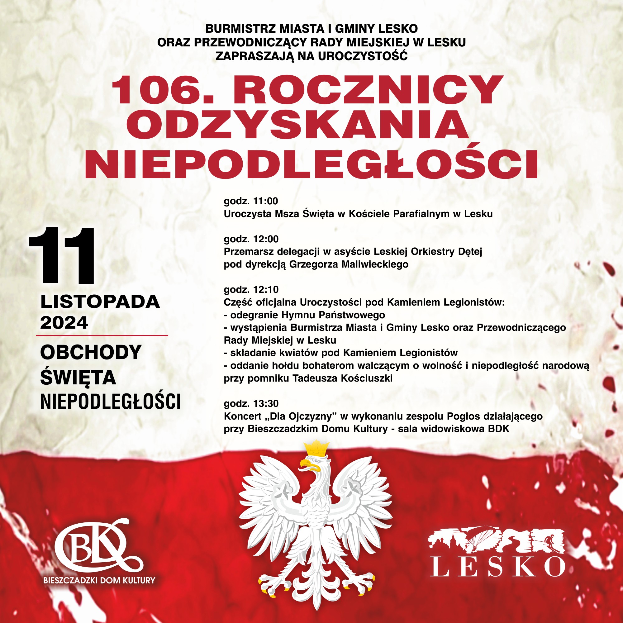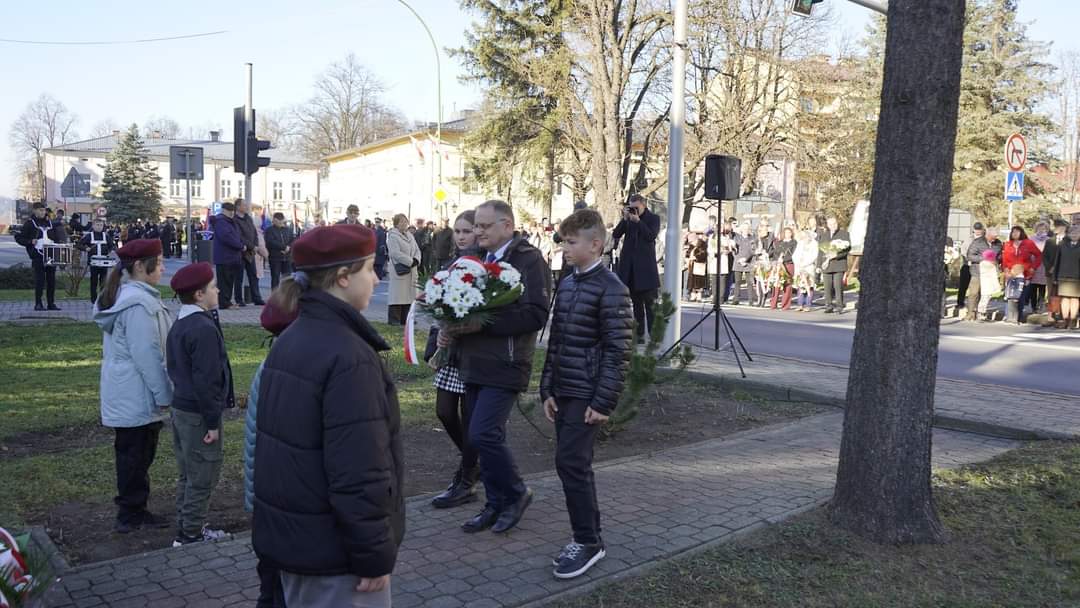 Gminne obchody 106. rocznicy odzyskania Niepodległości w dniu 11 listopada 2024 r. rozpoczęły się o godzinie 11:00 uroczystą mszą św. w kościele parafialnym w Lesku. Po jej zakończeniu, tuż po godzinie 12:00, delegacje szkół i instytucji działających na terenie naszej gminy i powiatu wyruszyły ulicami miasta w okolice ratusza, gdzie złożyły wiązanki kwiatów pod Kamieniem Legionistów. Następnie barwny pochód udał się na leskie planty, by złożyć kwiaty także pod pomnikiem Tadeusza Kościuszki. W tym roku podczas gminnych uroczystości naszą szkołę reprezentowali uczniowie klasy VI wraz z Panem Dyrektorem, nauczycielem historii i przewodniczącą Rady Rodziców.