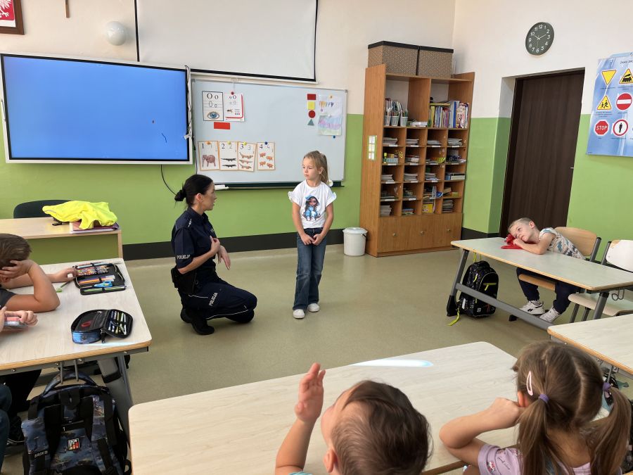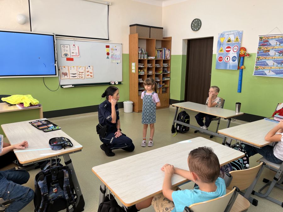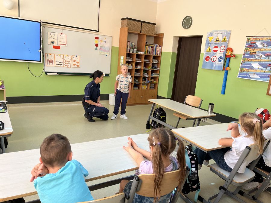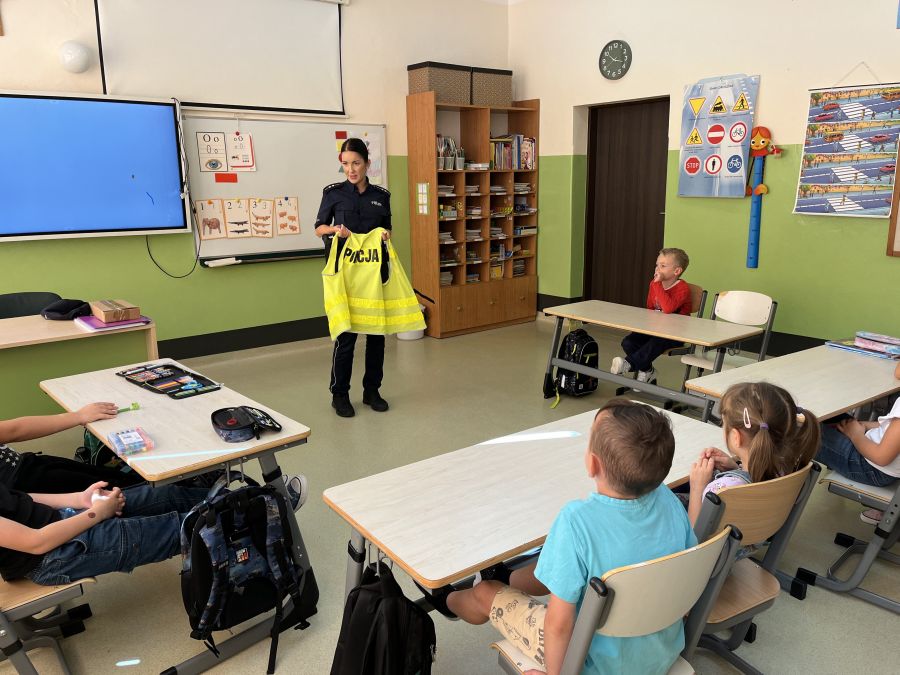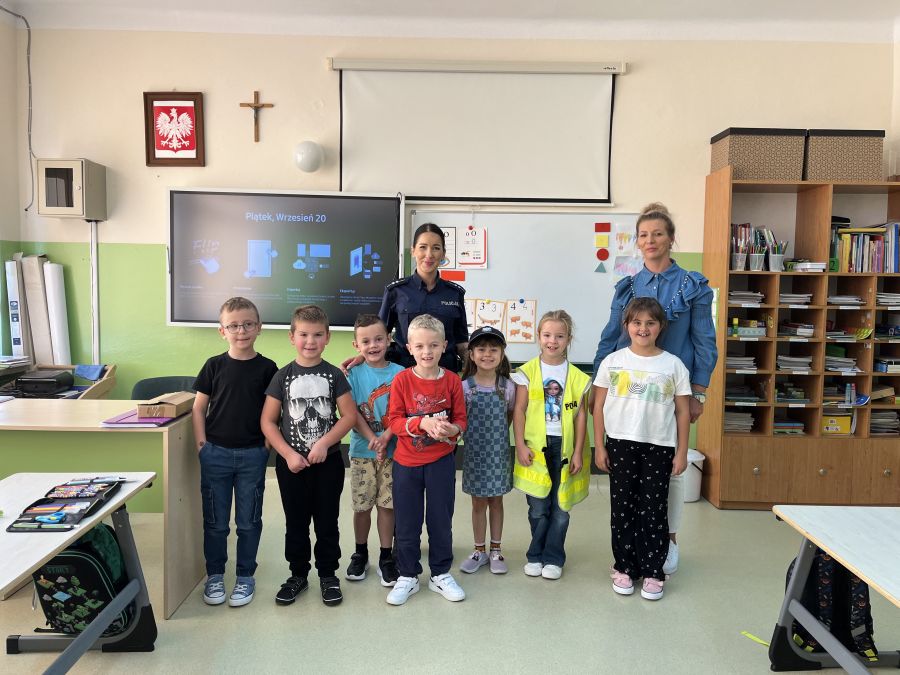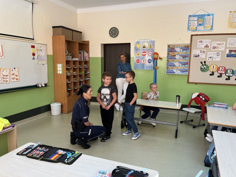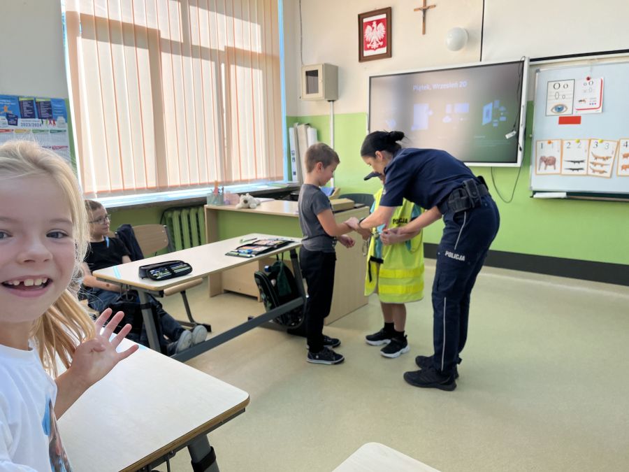 Dnia 19 września 2024 r. klasę I odwiedziła funkcjonariuszka Policji Powiatowej w Lesku pani Natalia Brzozowska. Nasi uczniowie mieli okazję usystematyzować swoją wiedzę dotyczącą bezpiecznego poruszania się po drodze, przypomnieli sobie numery alarmowe, dowiedzieli się, jak zachować się w przypadku, gdy obcy człowiek zaprasza do samochodu lub zaczepia. Ponadto mieli okazję zobaczyć i przymierzyć kamizelkę odblaskową, kajdanki, czapkę policyjną. Dzieci otrzymały również odblaski. Spotkanie bardzo podobało się najmłodszym uczniom naszej szkoły. Dziękujemy!