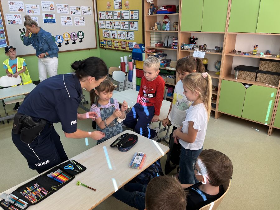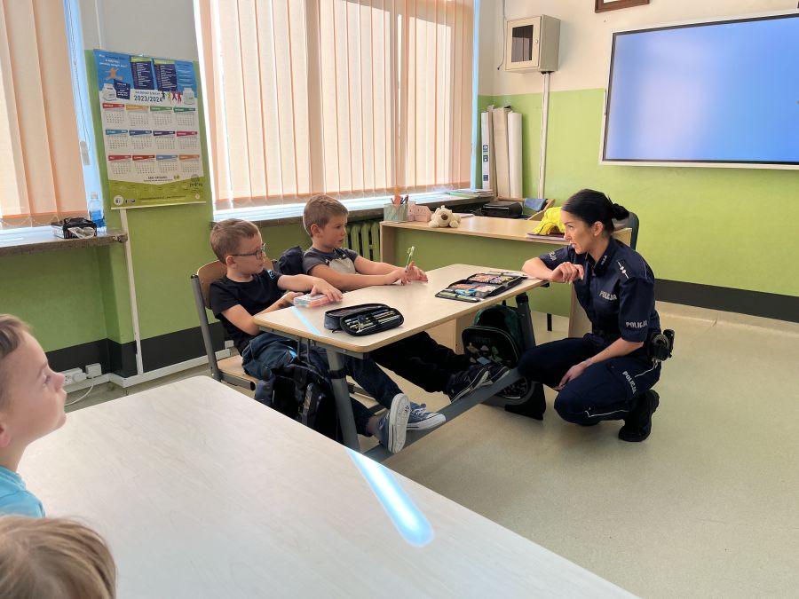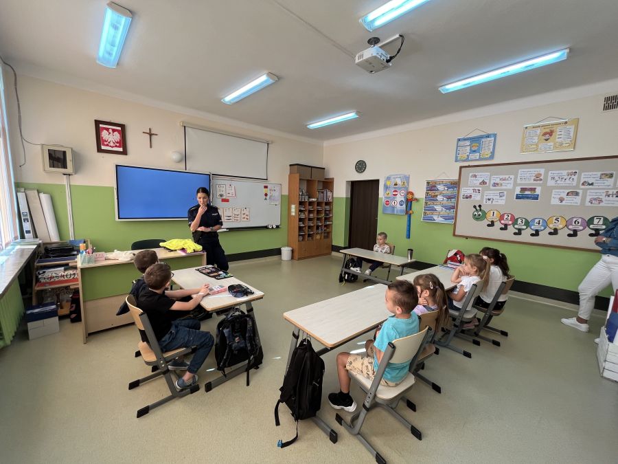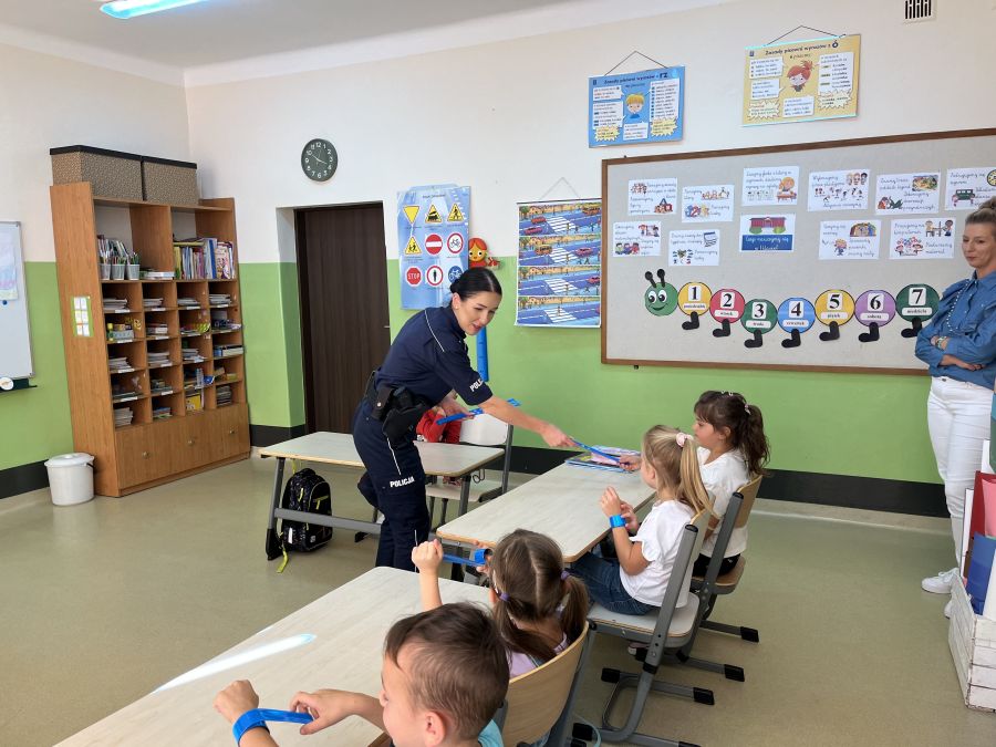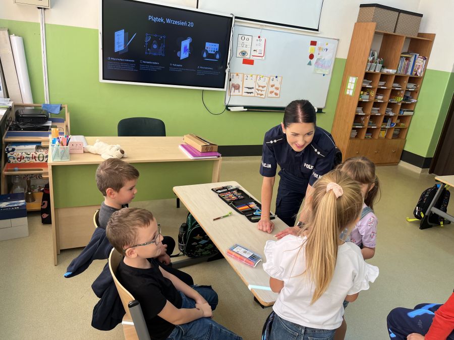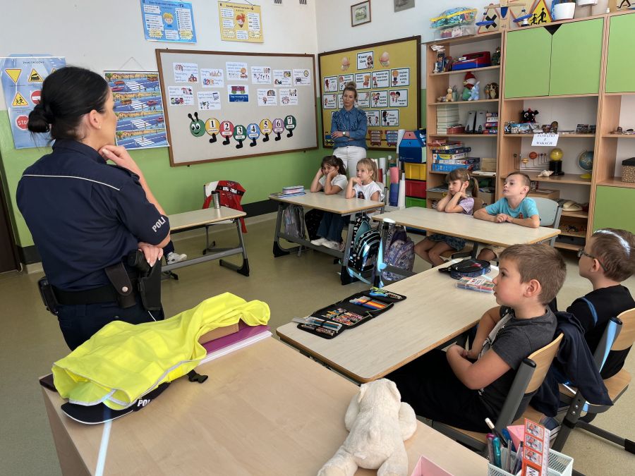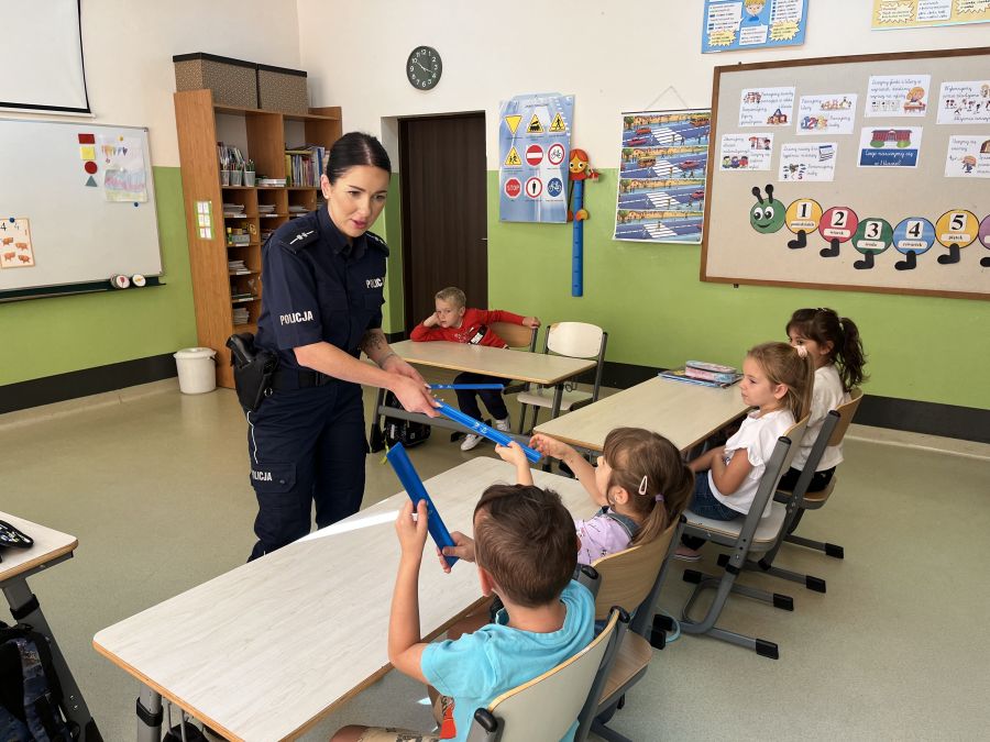 Dnia 19 września 2024 r. klasę I odwiedziła funkcjonariuszka Policji Powiatowej w Lesku pani Natalia Brzozowska. Nasi uczniowie mieli okazję usystematyzować swoją wiedzę dotyczącą bezpiecznego poruszania się po drodze, przypomnieli sobie numery alarmowe, dowiedzieli się, jak zachować się w przypadku, gdy obcy człowiek zaprasza do samochodu lub zaczepia. Ponadto mieli okazję zobaczyć i przymierzyć kamizelkę odblaskową, kajdanki, czapkę policyjną. Dzieci otrzymały również odblaski. Spotkanie bardzo podobało się najmłodszym uczniom naszej szkoły. Dziękujemy!