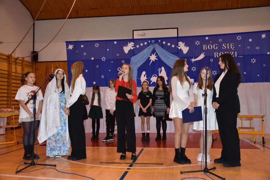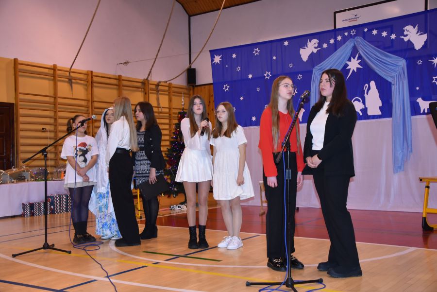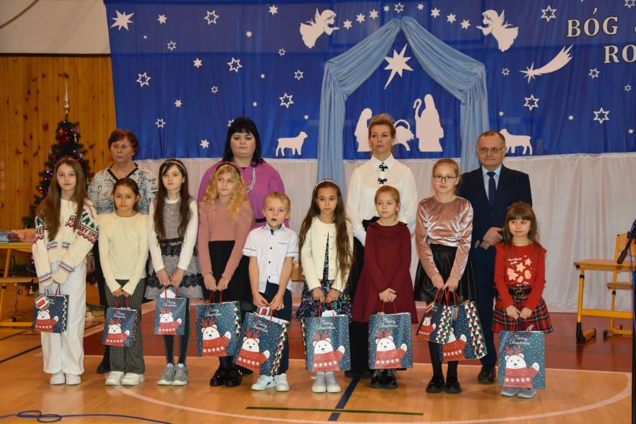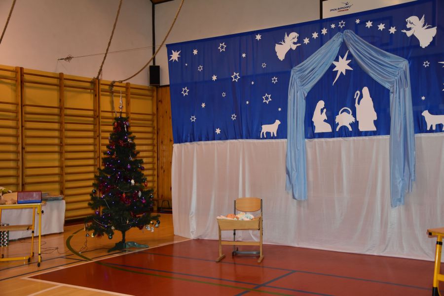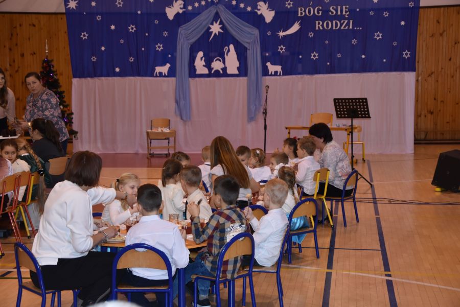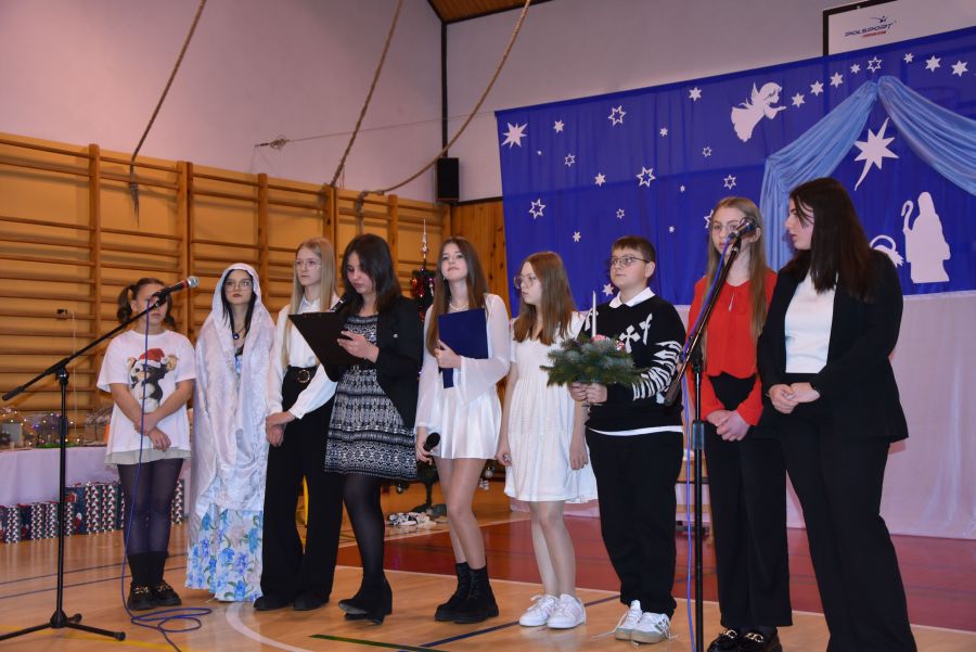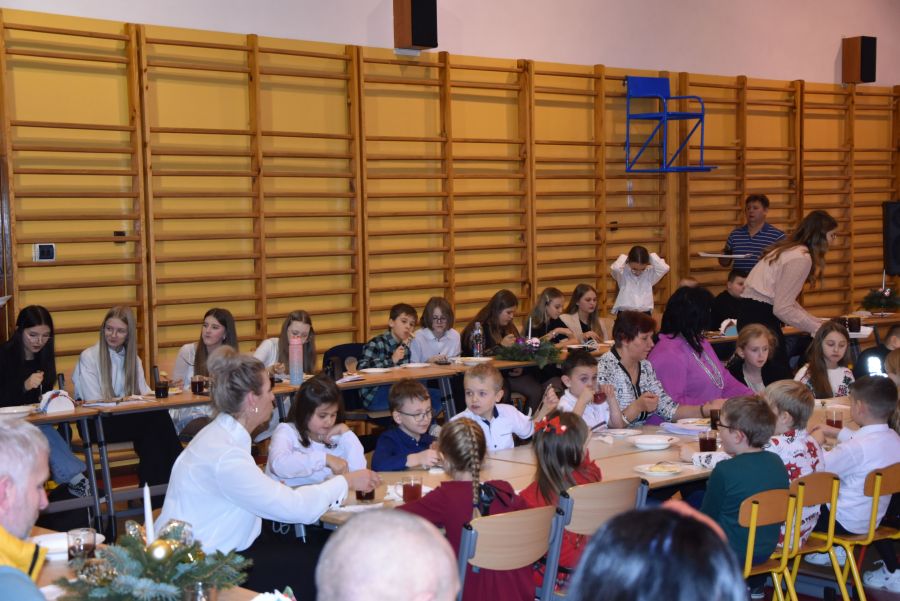 Za kilka dni w każdym z naszych domów zasiądziemy do wigilijnego stołu, by podzielić się opłatkiem, skosztować przepysznych dwunastu potraw, spędzić czas w gronie najbliższych i najbardziej kochanych osób. Niedługo potem nasz parafialny kościół zabrzmi na Pasterce potężnym śpiewam najpiękniejszych polskich kolęd... Nim jednak to nastąpi, przedszkolaki, uczniowie, nauczyciele, pracownicy szkoły oraz rodzice spotkali się w piątek 20 grudnia 2024 r. na szkolnej sali gimnastycznej, by poczuć nastrój nadchodzących świąt podczas słuchania wierszy i współczesnych kolęd i pastorałek, podzielić się opłatkiem z kolegami z klasy oraz zasiąść do szkolnej wigilii.