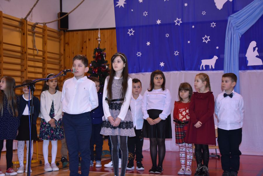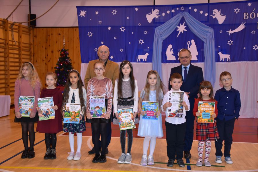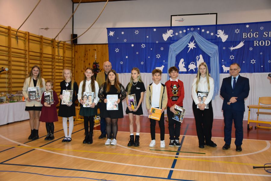 Jako pierwsze przed tak wspaniałą publicznością wystąpiły przedszkolaki, pięknie tańcząc w rytm dziecięcych kolęd, następnie na szkolną scenę wkroczyli uczniowie klas I - III z wierszami i piosenkami świątecznymi i bożonarodzeniowymi, a na koniec wystąpili uczniowie klas IV - VIII, także recytując, śpiewając i grając na instrumentach oraz inscenizując skłaniające do refleksji scenki. Po zakończeniu wspaniałych występów, które w niczym nie ustępowały tym, jakie możemy oglądać w telewizji, nastąpiło rozstrzygnięcie konkursów na najpiękniejszą szopkę i kartkę bożonarodzeniową. Zwycięskie prace będą reprezentować naszą szkołę podczas konkursu gminnego, którego zakończenie nastąpi w styczniu w Bieszczadzkim Domu Kultury w Lesku. Ciekawymi i pięknie wydanymi książkami zostali także nagrodzeni laureaci i wszyscy uczestnicy konkursu czytelniczego zorganizowanego przez naszą szkolną bibliotekę w dwóch grupach wiekowych. Jego celem było stworzenie ilustracji do swojej ulubionej książki.