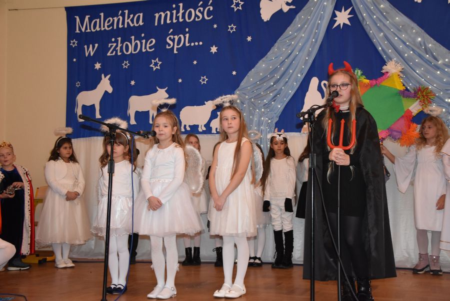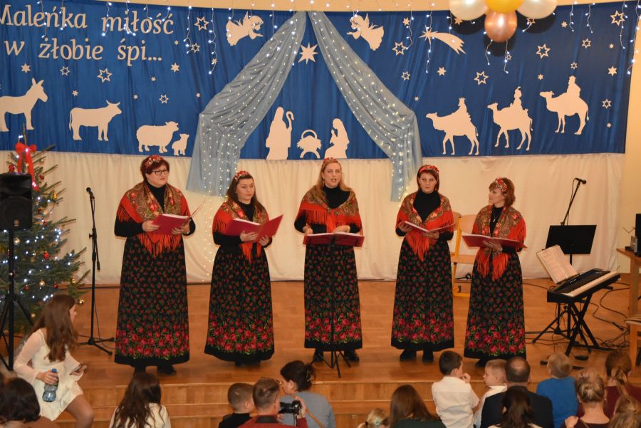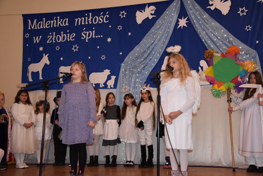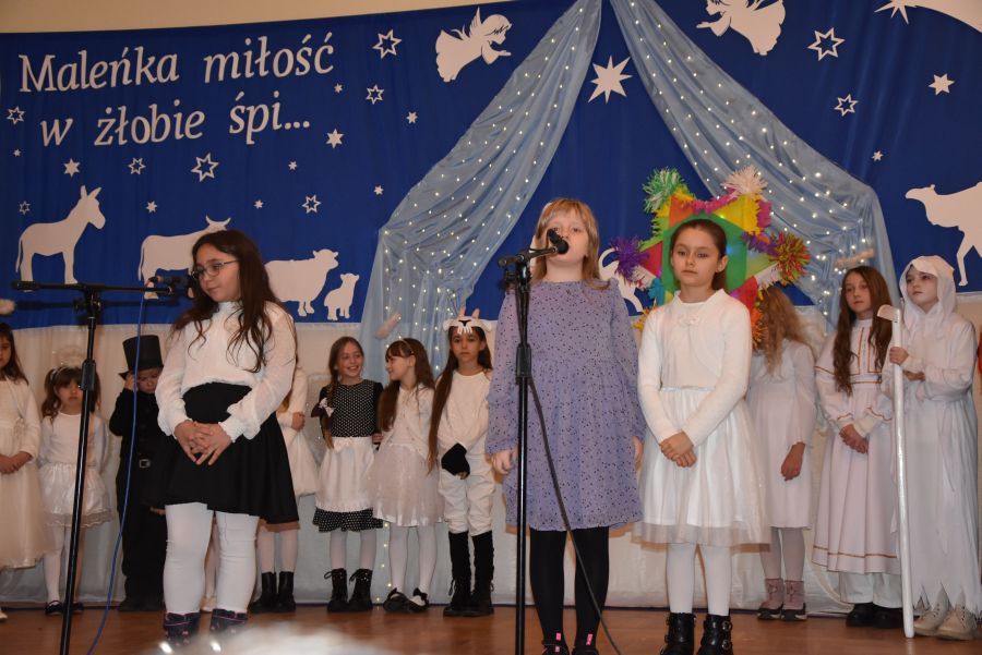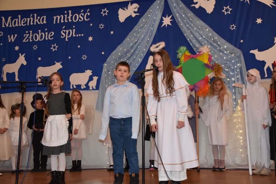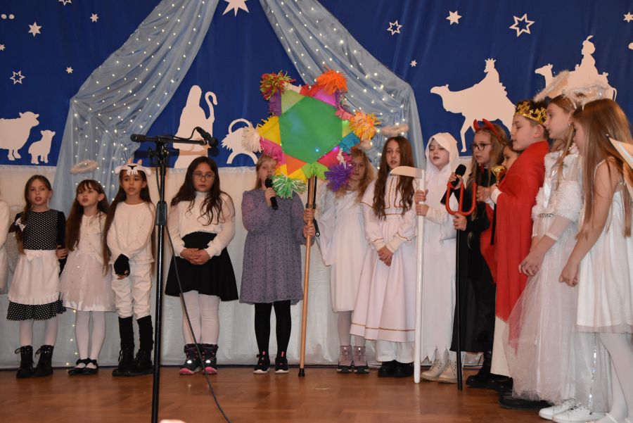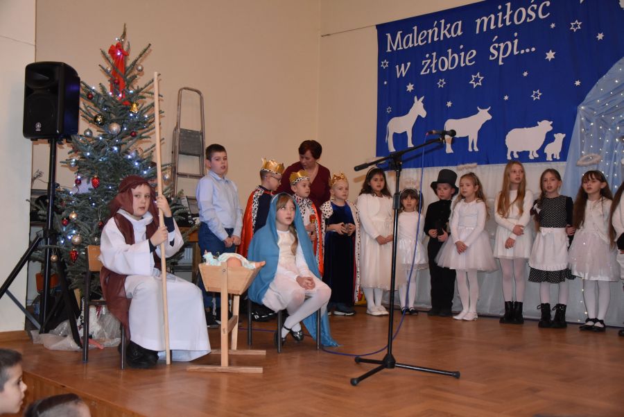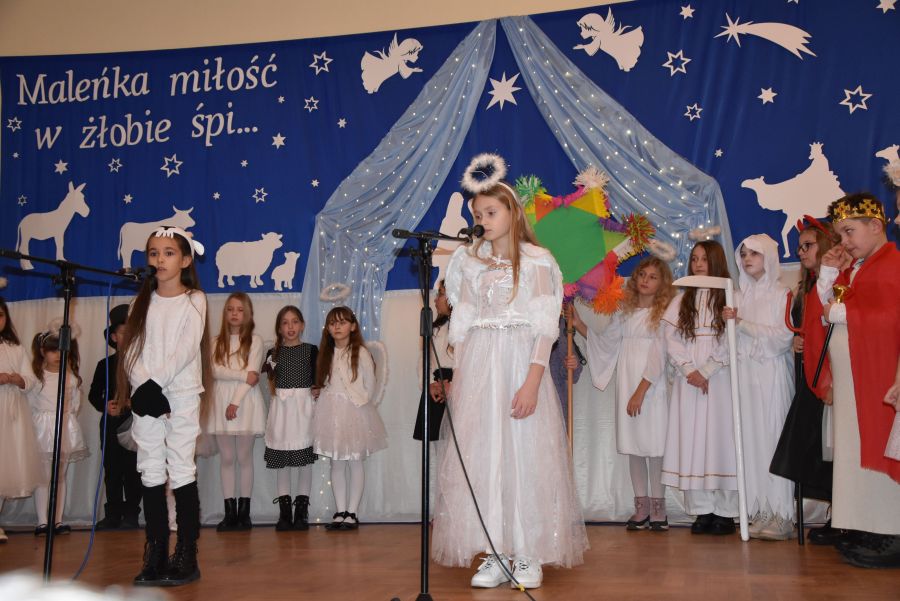 Wieczór ten rozpoczął się o godzinie 16:00 występem dzieci z przedszkola, które zaprezentowały taniec aniołków do kolędy "Świeć, gwiazdeczko, świeć". Następnie z gwiazdą i kolędą "Wśród nocnej ciszy" na scenę wkroczyli uczniowie klas I - III jako kolędnicy, którzy chodzą od domu do domu i życzą mieszkańcom szczęścia i wszelkiej pomyślności. Był turoń, diabełek, aniołki, śmierć, koza, Król Herod, kominiarz, pastuszkowie, bocian oraz Józef i Maryja z Dzieciątkiem, a także Trzej Królowie. Uczniowie profesjonalnie odegrali swoje role, prezentując historię Bożego Narodzenia. Porwali oni też publiczność pięknym wykonaniem współczesnych kolęd i pastorałek. Po nich sceną zawładnęli uczniowie klas IV - VIII, prezentując skłaniające do refleksji scenki z codziennego życia oraz wzruszając i zachwycając doskonałymi wykonaniami współczesnych piosenek bożonarodzeniowych.