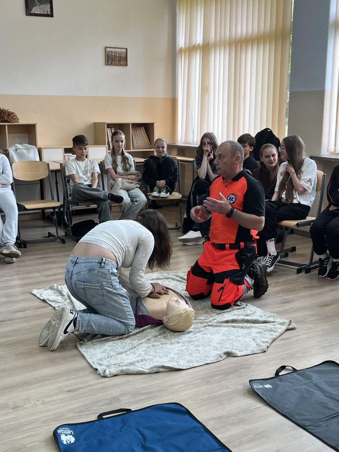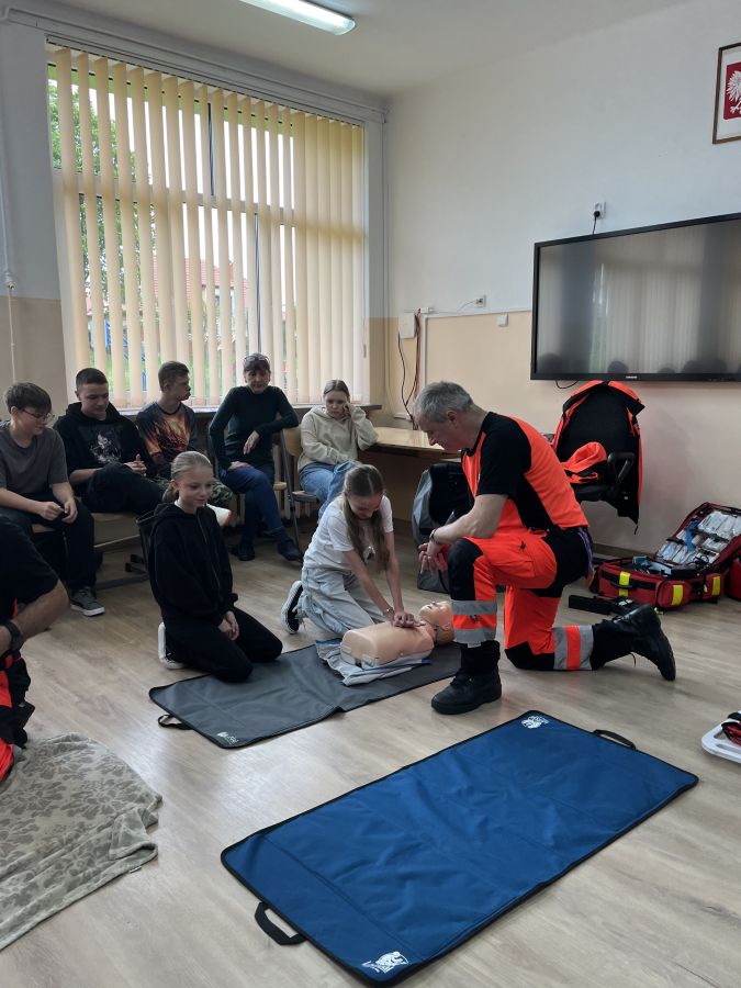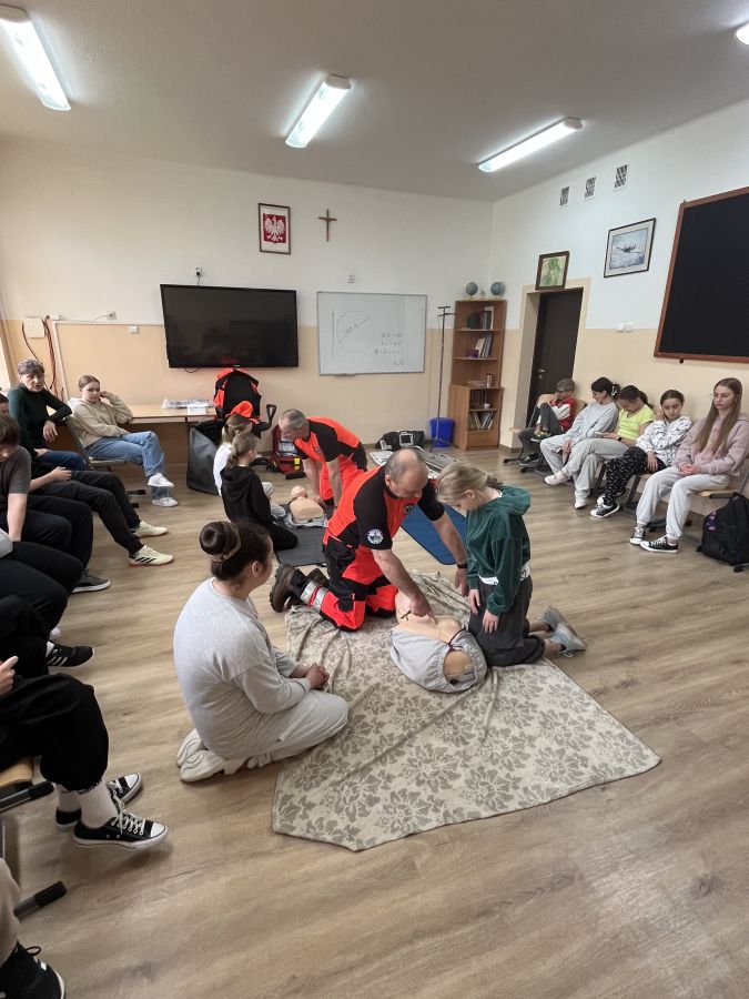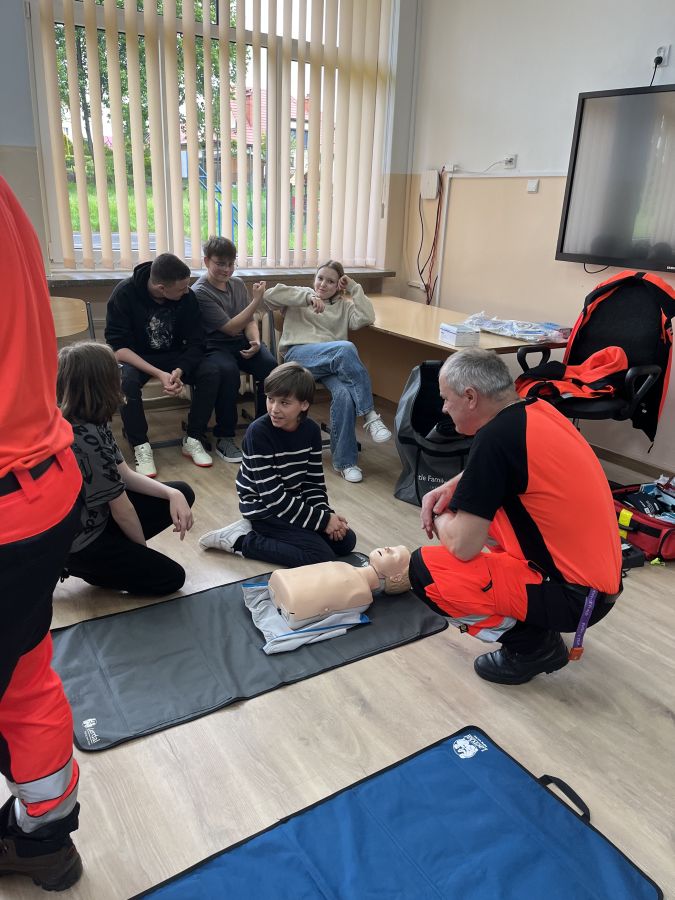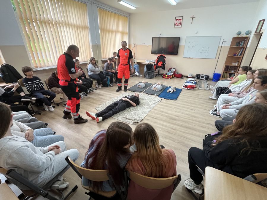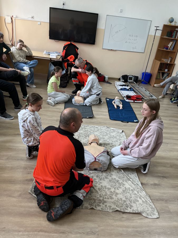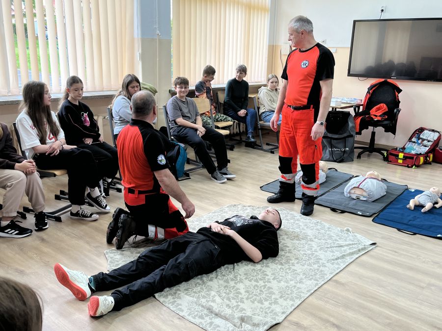 20 maja 2025 r. klasy IV - VIII odwiedzili ratownicy medyczni pracujący w Bieszczadzkim Pogotowiu Ratunkowym z siedzibą w Sanoku. Ratownicy podczas spotkania pokazali uczniom specjalistyczny sprzęt, którym posługują się na co dzień w karetce i opowiedzieli o swojej pracy. Poinstruowali, w jaki sposób należy wezwać karetkę pogotowia, jak rozmawiać z dyspozytorem. Udzielili szczegółowych wyjaśnień, jak należy przeprowadzać resuscytację krążeniowo-oddechową. Każdy z uczestników spotkania mógł pod okiem naszych gości przećwiczyć RKO na fantomie. Kolejno nauczyliśmy się układać pacjenta w pozycji bocznej bezpiecznej. Było to niezwykle ważne spotkanie, gdyż wiemy już, jak udzielić pierwszej pomocy przedmedycznej. Jeszcze raz serdeczne podziękowania kierujemy do Ratowników Medycznych Bieszczadzkiego Pogotowia Ratunkowego SPZOZ w Sanoku.