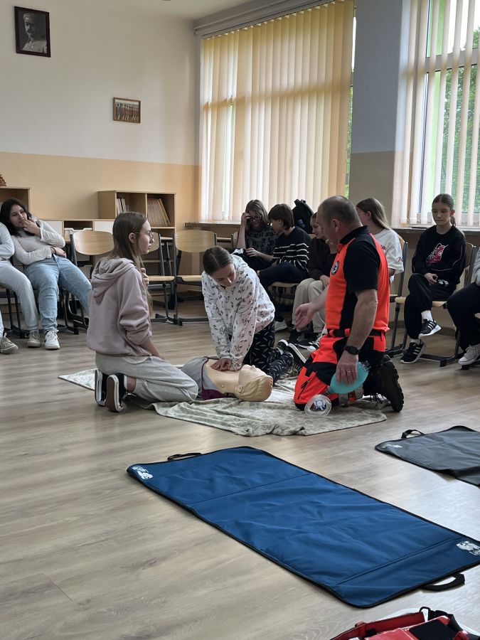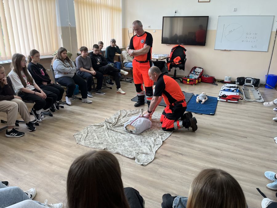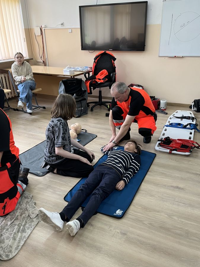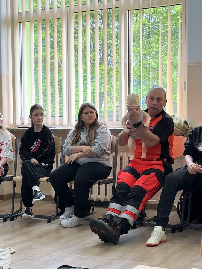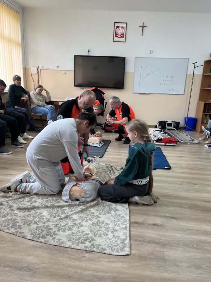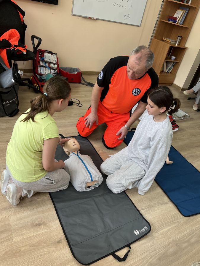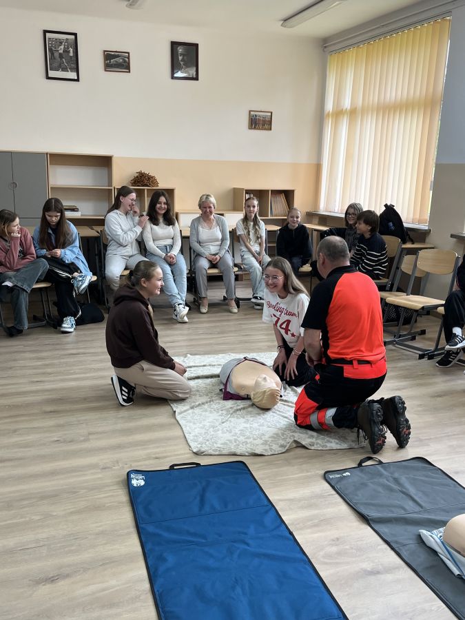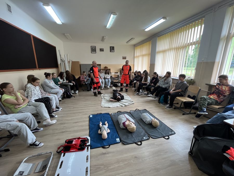 20 maja 2025 r. klasy IV - VIII odwiedzili ratownicy medyczni pracujący w Bieszczadzkim Pogotowiu Ratunkowym z siedzibą w Sanoku. Ratownicy podczas spotkania pokazali uczniom specjalistyczny sprzęt, którym posługują się na co dzień w karetce i opowiedzieli o swojej pracy. Poinstruowali, w jaki sposób należy wezwać karetkę pogotowia, jak rozmawiać z dyspozytorem. Udzielili szczegółowych wyjaśnień, jak należy przeprowadzać resuscytację krążeniowo-oddechową. Każdy z uczestników spotkania mógł pod okiem naszych gości przećwiczyć RKO na fantomie. Kolejno nauczyliśmy się układać pacjenta w pozycji bocznej bezpiecznej. Było to niezwykle ważne spotkanie, gdyż wiemy już, jak udzielić pierwszej pomocy przedmedycznej. Jeszcze raz serdeczne podziękowania kierujemy do Ratowników Medycznych Bieszczadzkiego Pogotowia Ratunkowego SPZOZ w Sanoku.