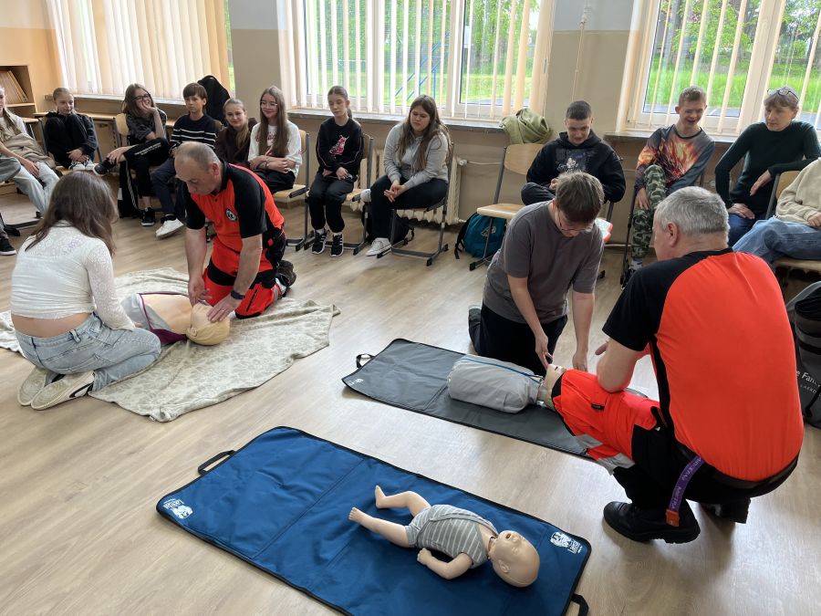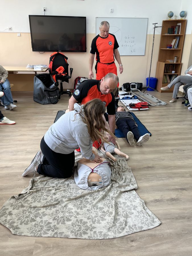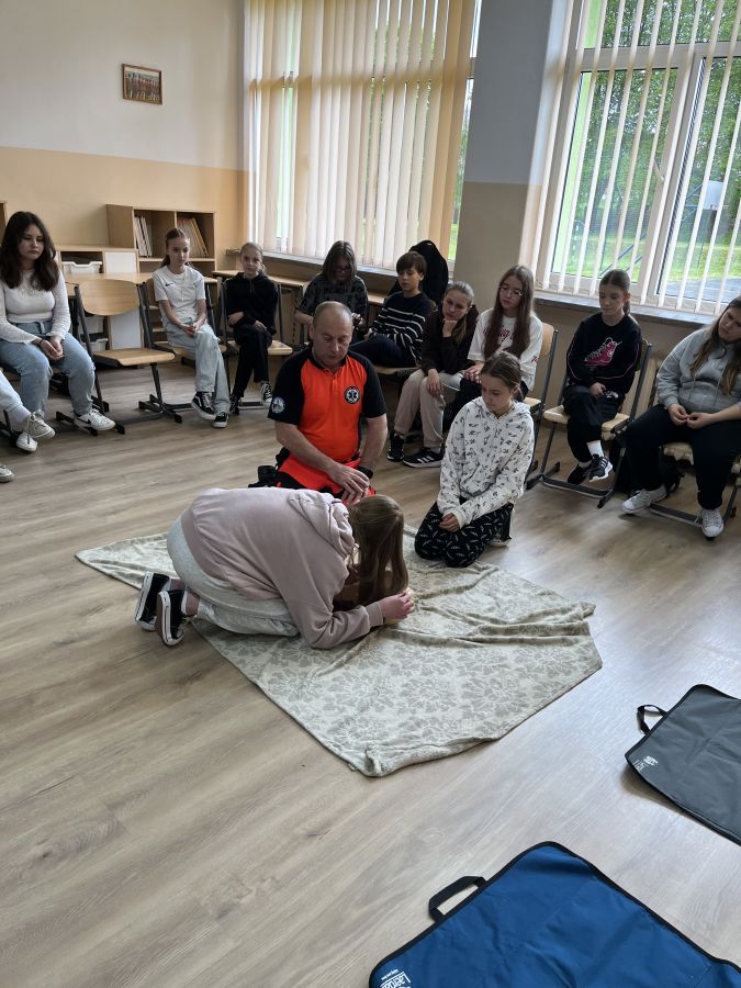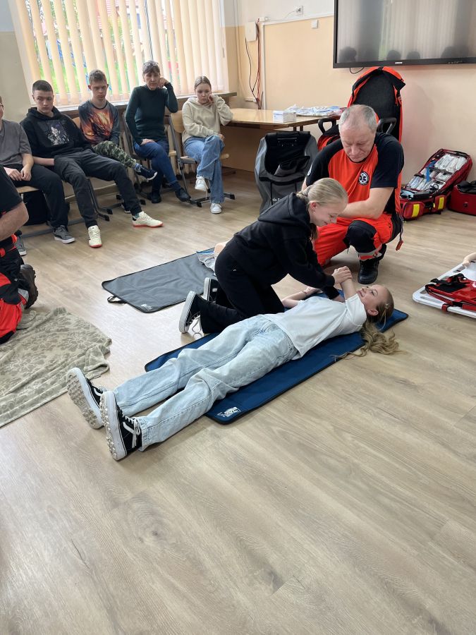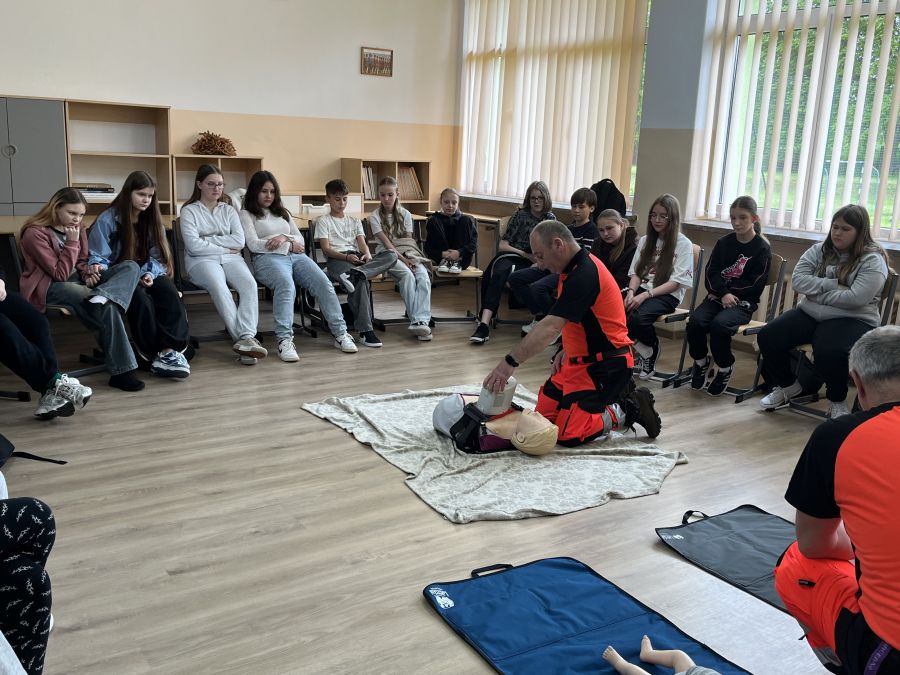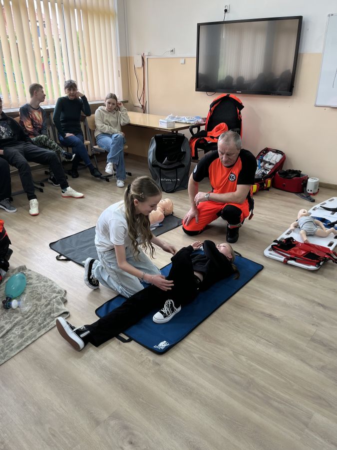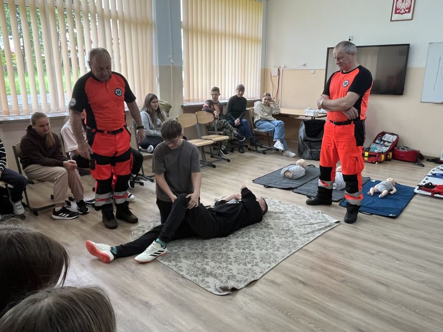 20 maja 2025 r. klasy IV - VIII odwiedzili ratownicy medyczni pracujący w Bieszczadzkim Pogotowiu Ratunkowym z siedzibą w Sanoku. Ratownicy podczas spotkania pokazali uczniom specjalistyczny sprzęt, którym posługują się na co dzień w karetce i opowiedzieli o swojej pracy. Poinstruowali, w jaki sposób należy wezwać karetkę pogotowia, jak rozmawiać z dyspozytorem. Udzielili szczegółowych wyjaśnień, jak należy przeprowadzać resuscytację krążeniowo-oddechową. Każdy z uczestników spotkania mógł pod okiem naszych gości przećwiczyć RKO na fantomie. Kolejno nauczyliśmy się układać pacjenta w pozycji bocznej bezpiecznej. Było to niezwykle ważne spotkanie, gdyż wiemy już, jak udzielić pierwszej pomocy przedmedycznej. Jeszcze raz serdeczne podziękowania kierujemy do Ratowników Medycznych Bieszczadzkiego Pogotowia Ratunkowego SPZOZ w Sanoku.