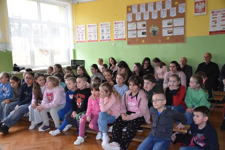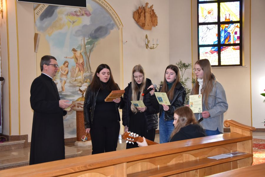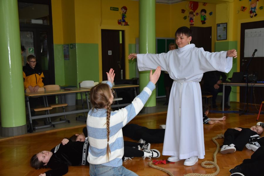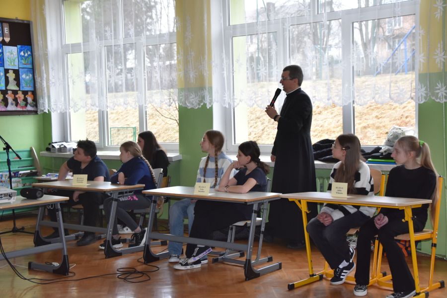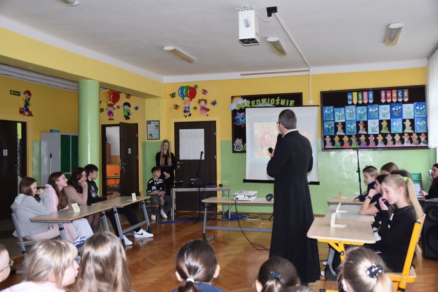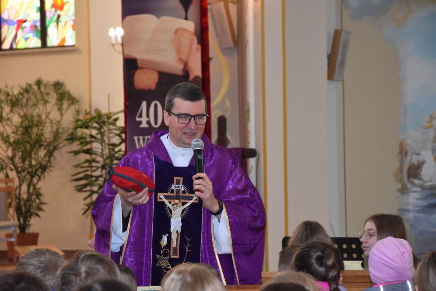 W dniach 12 - 13 marca 2025 r. społeczność naszej szkoły uczestniczyła w rekolekcjach wielkopostnych, które prowadził katecheta ksiądz Grzegorz Łach przy współudziale siostry Magdaleny ze zgromadzenia Sióstr Misjonarek św. Piotra Klawera. W pierwszym dniu siostra opowiedziała zgromadzonym o warunkach, w jakich mieszkają ludzie w krajach Afryki i posłudze, jaką pełnią wśród nich misjonarze. Dzięki piosenkom, przywiezionym eksponatom z krośnieńskiego muzeum misyjnego, spotkanie na długo zapadło nam w pamięci. Najważniejszym punktem pierwszego dnia była Msza Święta, której oprawę liturgiczną przygotowały uczennice naszej wspólnoty. Drugi dzień rozpoczęliśmy w szkole, uczestnicząc w quizie biblijnym poświęconym Biblii, życiu Pana Jezusa i wydarzeniom roku liturgicznego. W rywalizacji brali udział najlepsi przedstawiciele każdej z klas. Odpowiedzi udzielane w trakcie quizu świadczyły o wielkiej znajomości Pisma Świętego. Nasze rekolekcje zakończyliśmy w kościele uczestnictwem w Drodze Krzyżowej, której rozważania były oparte o wydarzenia z codziennego życia młodych ludzi. Na zakończenie podziękowaliśmy bardzo serdecznie za prowadzenie rekolekcji siostrze Magdalenie i księdzu Grzegorzowi.