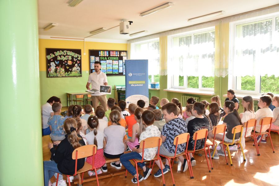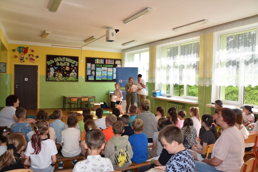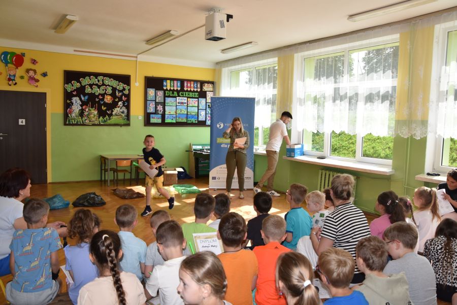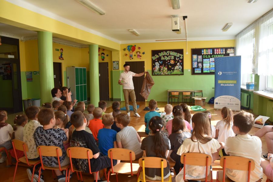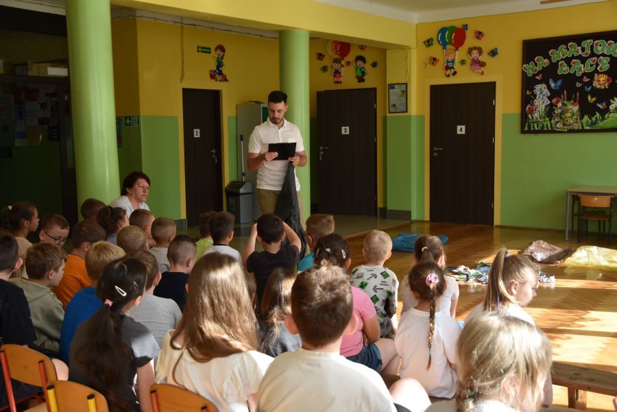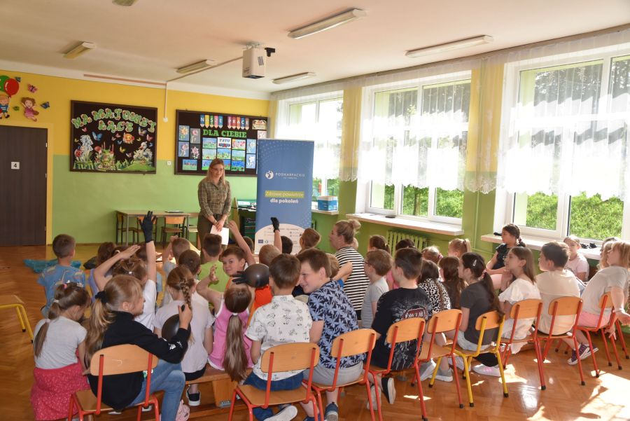 Dnia 5 czerwca 2025 r. w naszej szkole odbyły się warsztaty LIFE - "Podkarpackie - żyj i oddychaj". Udział w nich wzięły klasy edukacji wczesnoszkolnej oraz przedszkolna zerówka. Warsztaty dotyczyły walki ze smogiem oraz zachowań sprzyjających dbałości o czyste powietrze. Jednym z tematów były praktyczne zajęcia segregacji śmieci, rozpoznawanie leśnych zwierząt i ich tropów. Dzieci miały między innymi możliwość potrenować sobie segregację śmieci czy rozpoznać zwierzę leśne po tropach. Na zakończenie dzieci otrzymały dyplomy i drobne upominki. Dziękujemy za wspaniałe warsztaty.
