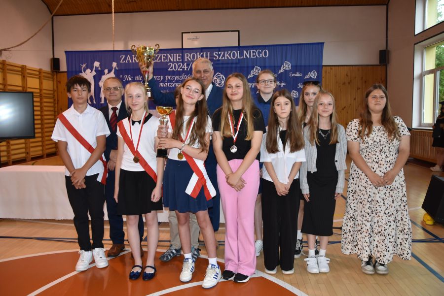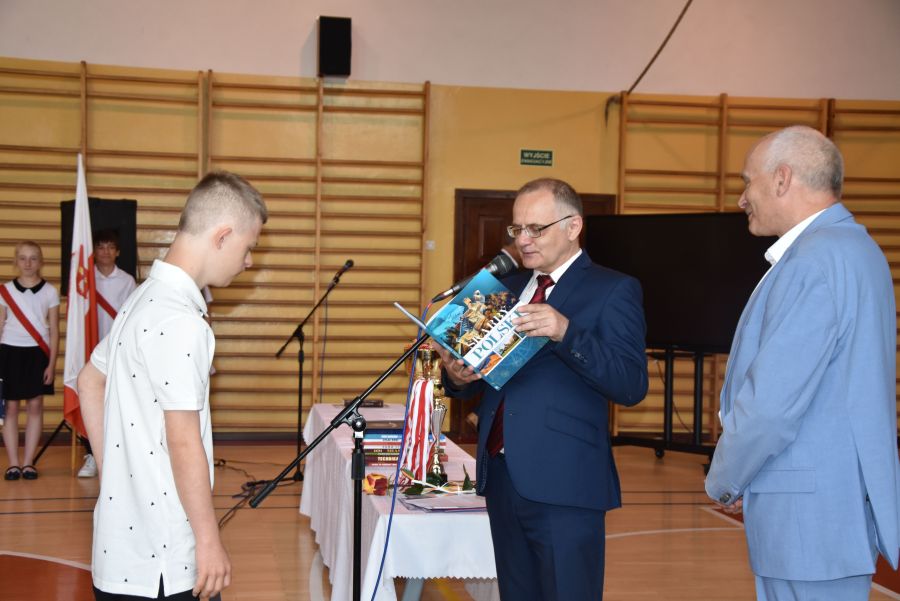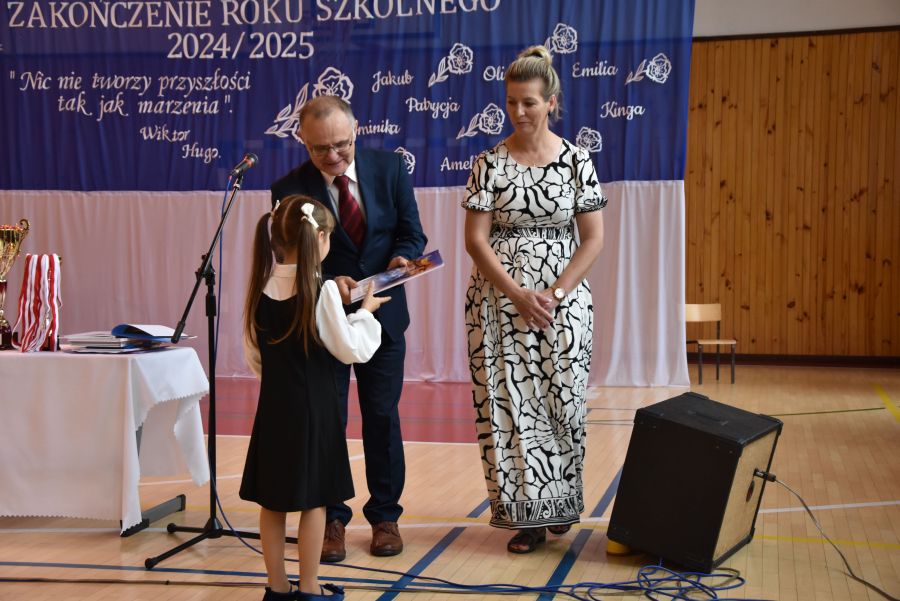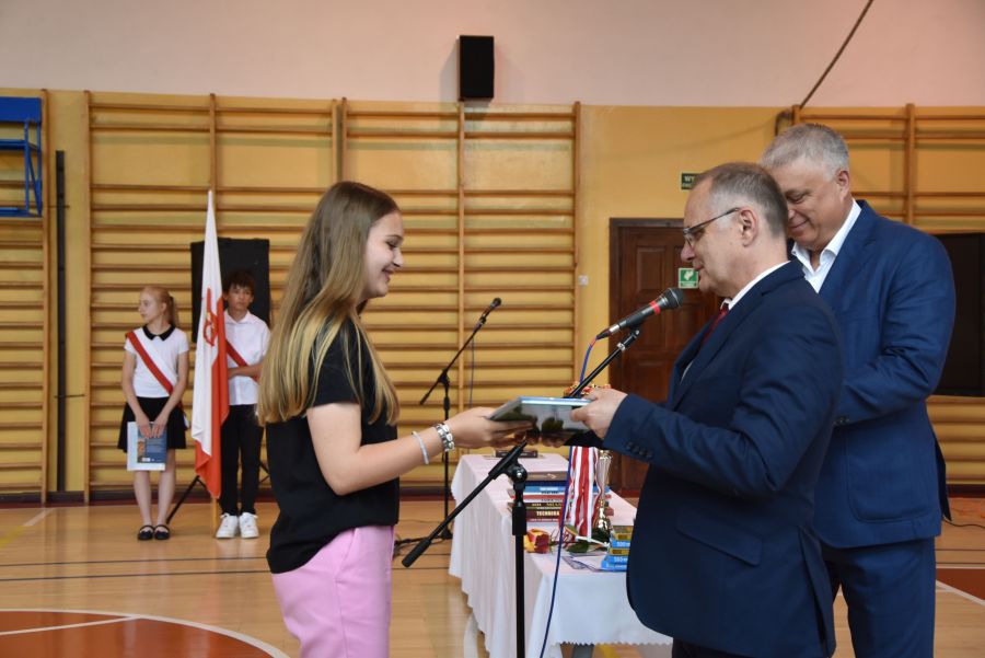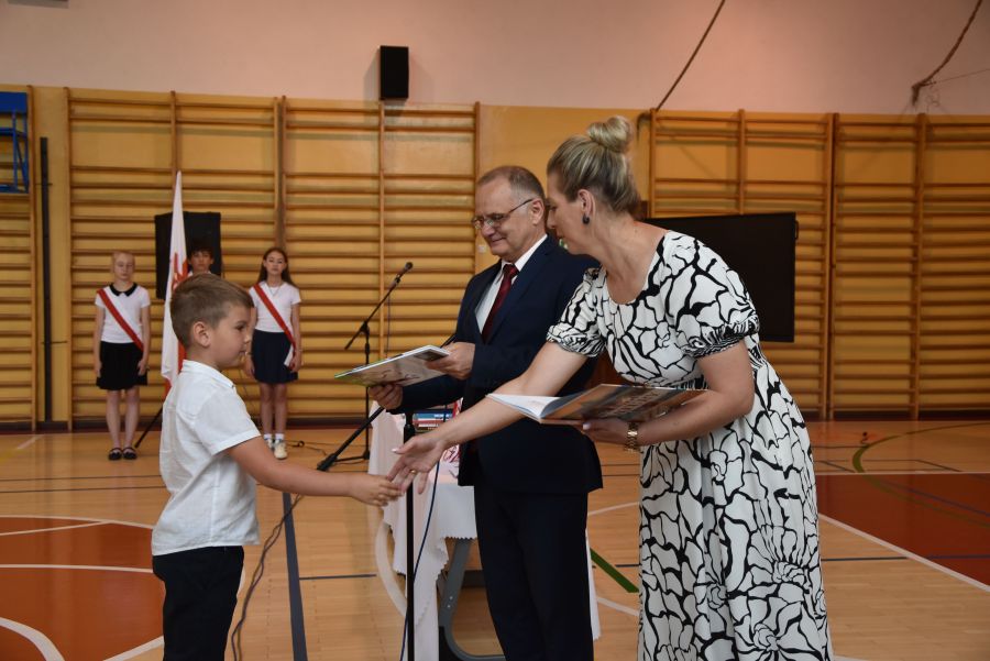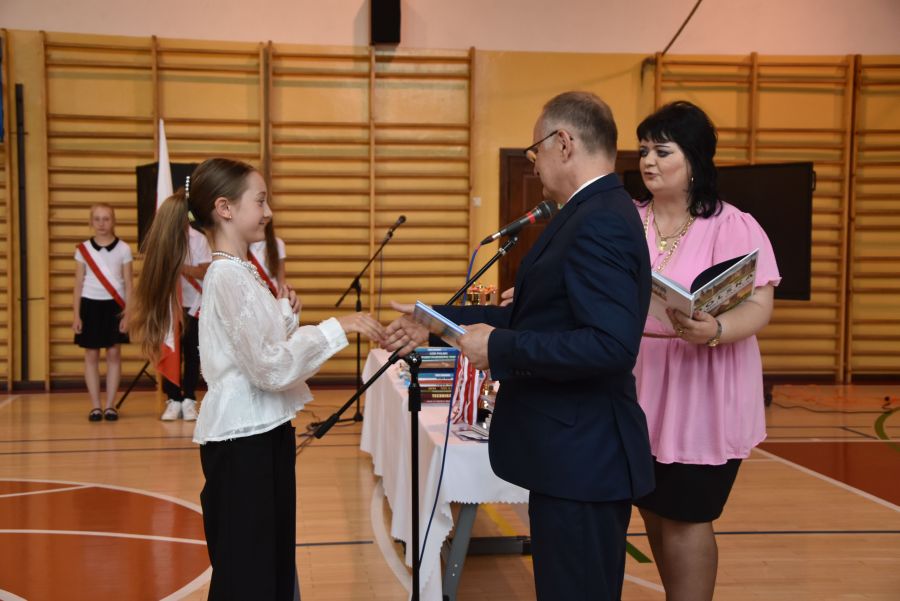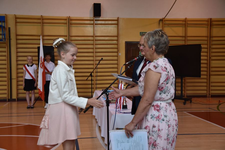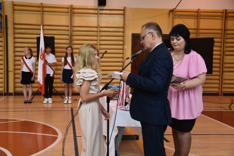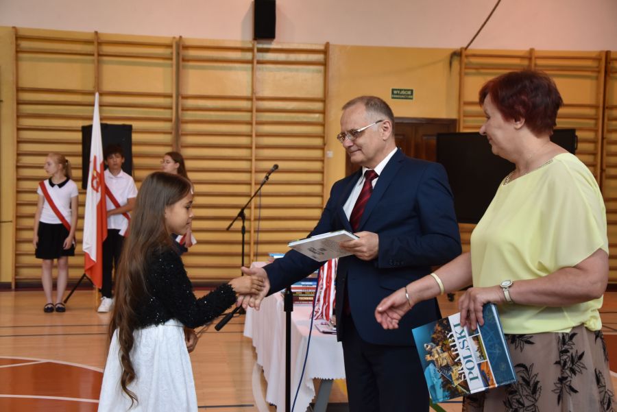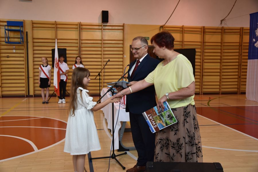 Po powitaniu miłych gości, Pan Dyrektor przypomniał sukcesy uczniów naszej szkoły w różnych konkursach pozaszkolnych i zawodach sportowych z minionego roku szkolnego, a następnie wspólnie z wychowawcami klas wręczył świadectwa z wyróżnieniem i nagrody książkowe uczniom, którzy uzyskali średnią ocen od 4,75 w górę. Świadectwa ukończenia szkoły wręczono także wszystkim absolwentom. Potem po troje najlepszych uczniów z klas V, VI i VIII zostało udekorowanych złotym, srebrnym i brązowym medalem za najwyższą średnią w klasie, zaś puchar dla najlepszego ucznia po raz trzeci otrzymała Julita Giefert z klasy VI za średnią 5,73. Pełen słodyczy Puchar Szkoły dla najlepszej klasy po raz trzeci trafił w ręce uczniów klasy VI, którzy w tym roku zdobyli kosmiczną średnią 5,10. Julicie Giefert wręczono także dyplom laureata i nagrody za zdobycie 9. miejsca w ogólnopolskim konkursie "Galileo" z języka angielskiego. Pan Dyrektor wręczył także listy gratulacyjne rodzicom dwóch uczennic klasy VIII, które uzyskały średnią ocen minimum 5,00, a na koniec wszyscy, którzy wspierali naszą szkołę, otrzymali pamiątkowe dyplomy "Przyjaciel Szkoły".