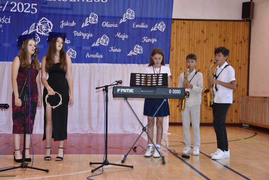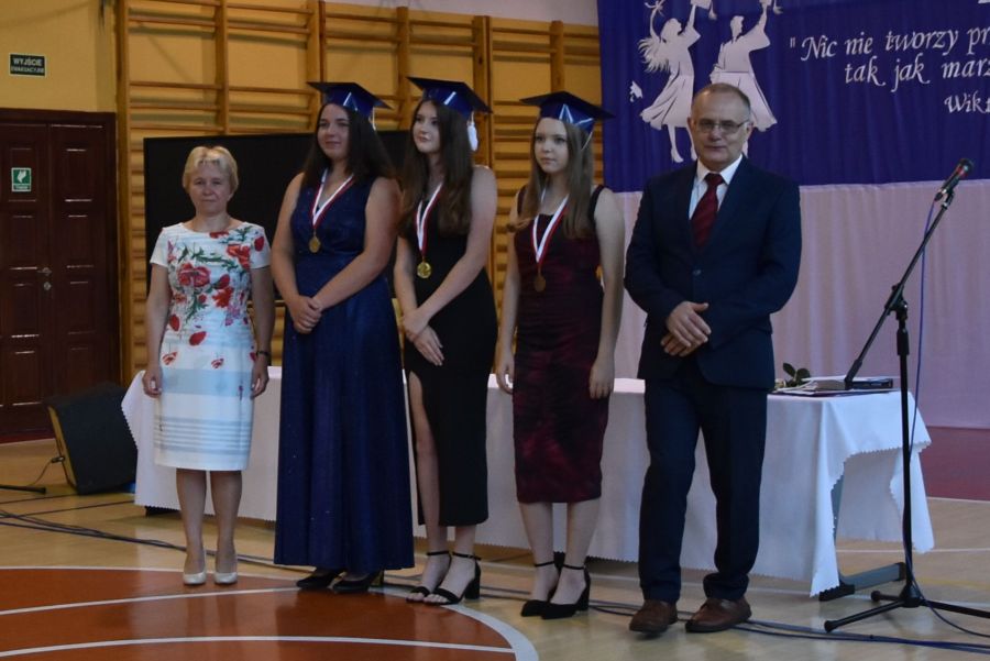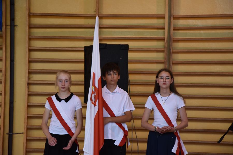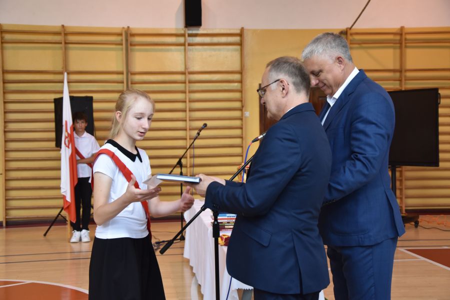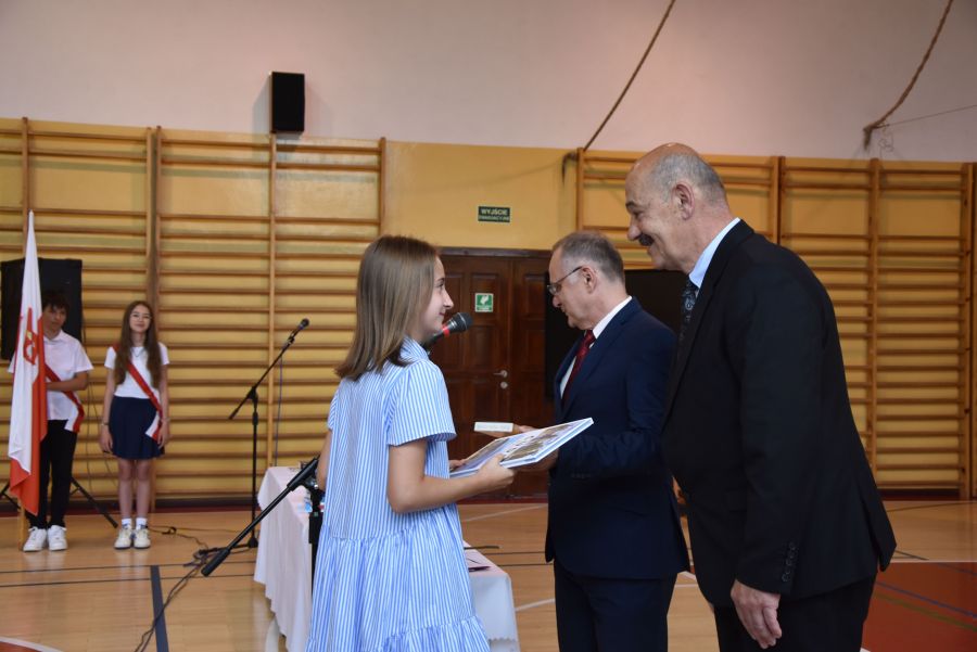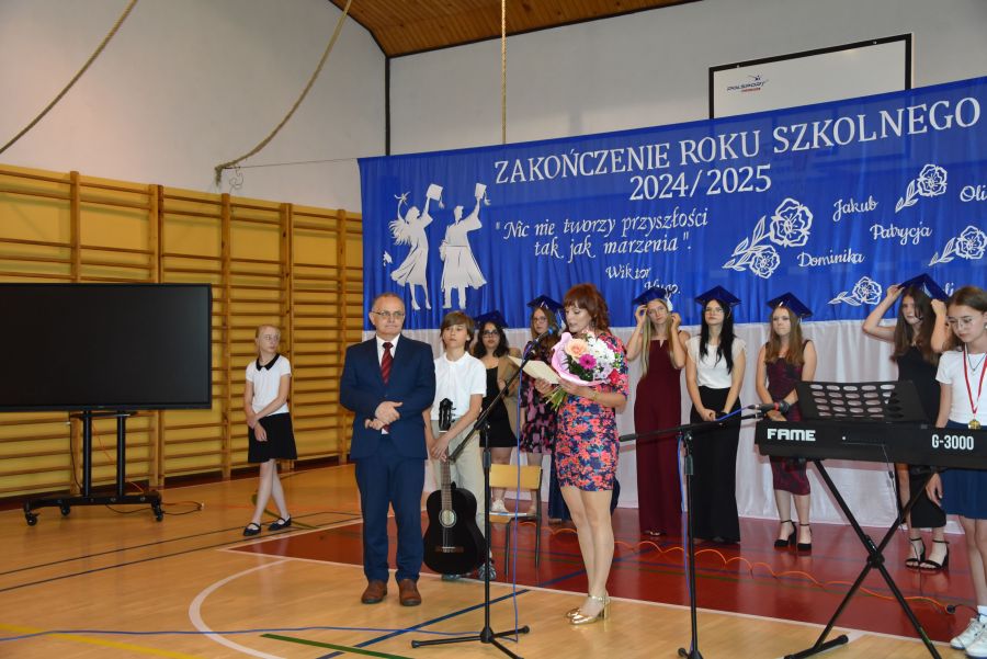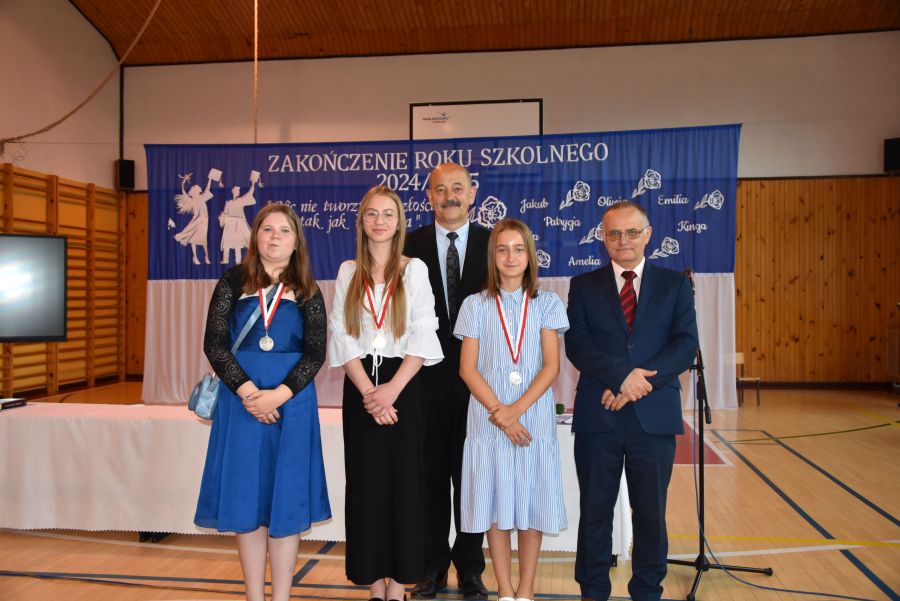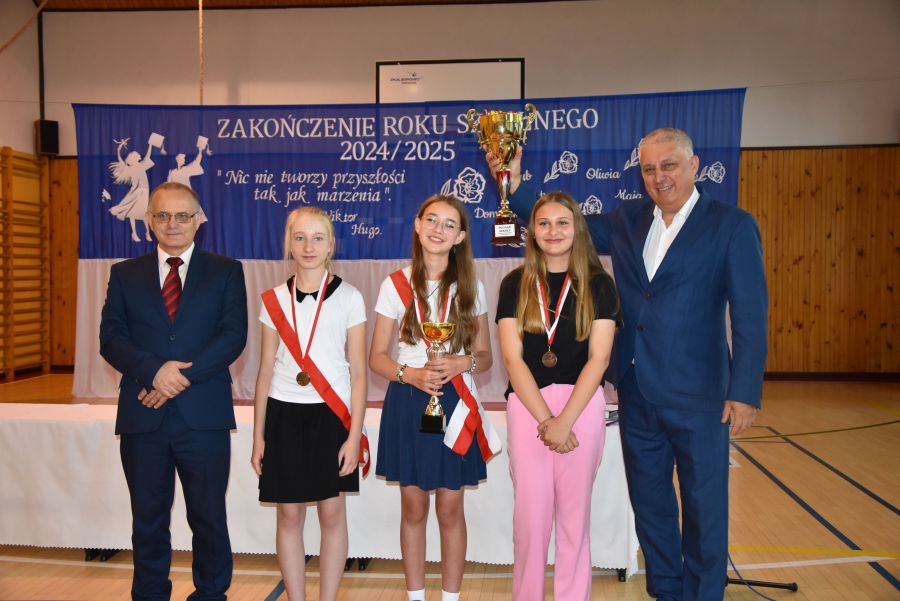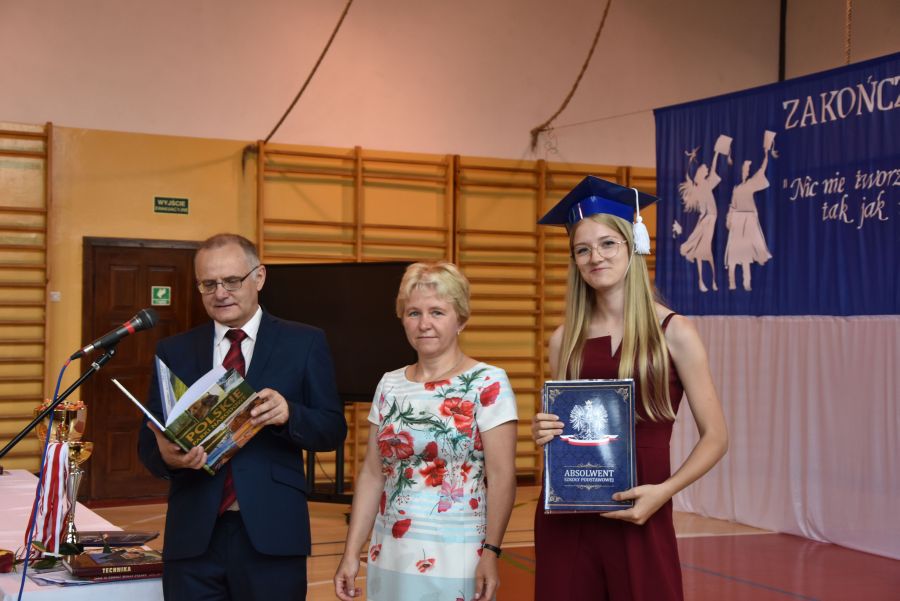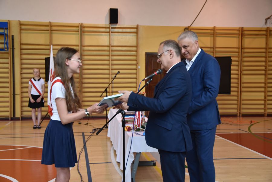Po powitaniu miłych gości, Pan Dyrektor przypomniał sukcesy uczniów naszej szkoły w różnych konkursach pozaszkolnych i zawodach sportowych z minionego roku szkolnego, a następnie wspólnie z wychowawcami klas wręczył świadectwa z wyróżnieniem i nagrody książkowe uczniom, którzy uzyskali średnią ocen od 4,75 w górę. Świadectwa ukończenia szkoły wręczono także wszystkim absolwentom. Potem po troje najlepszych uczniów z klas V, VI i VIII zostało udekorowanych złotym, srebrnym i brązowym medalem za najwyższą średnią w klasie, zaś puchar dla najlepszego ucznia po raz trzeci otrzymała Julita Giefert z klasy VI za średnią 5,73. Pełen słodyczy Puchar Szkoły dla najlepszej klasy po raz trzeci trafił w ręce uczniów klasy VI, którzy w tym roku zdobyli kosmiczną średnią 5,10. Julicie Giefert wręczono także dyplom laureata i nagrody za zdobycie 9. miejsca w ogólnopolskim konkursie "Galileo" z języka angielskiego. Pan Dyrektor wręczył także listy gratulacyjne rodzicom dwóch uczennic klasy VIII, które uzyskały średnią ocen minimum 5,00, a na koniec wszyscy, którzy wspierali naszą szkołę, otrzymali pamiątkowe dyplomy "Przyjaciel Szkoły".